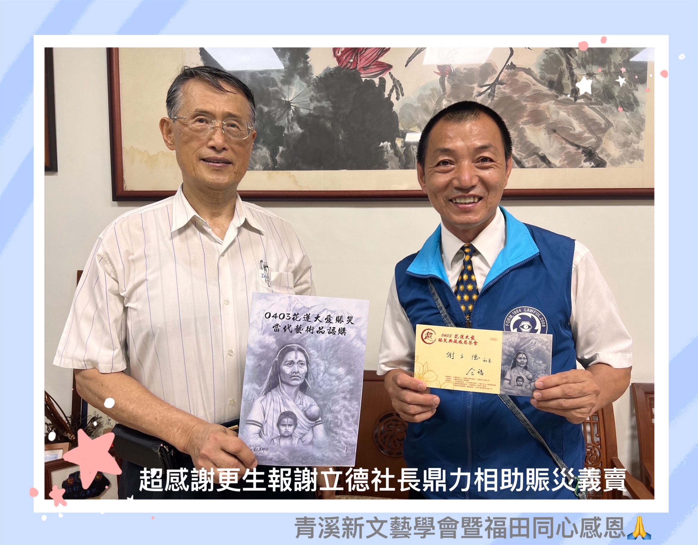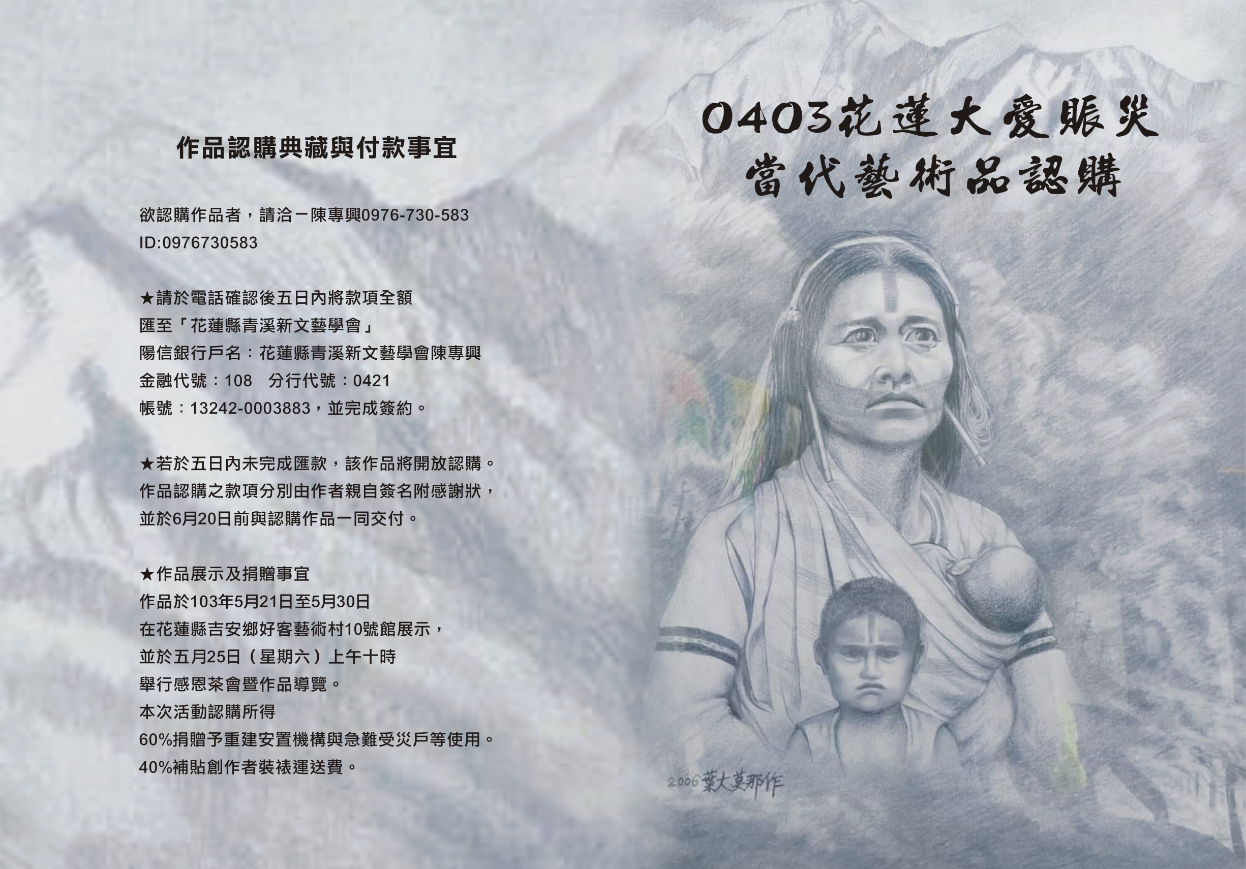 ○四○三大地震造成花蓮嚴重災情,許多房屋倒塌、損壞,上千人無家可歸,在此時刻,花蓮縣青溪新文藝學會於五月二十一日至三十日,在吉安鄉好客藝術村十號館舉辦「○四○三花蓮大愛賑災,當代藝術作品認購典藏展」(見圖:青溪提供),期盼由民間自發起的行動,將大家的愛心串連起來,一起陪伴花蓮,為花蓮撐腰。