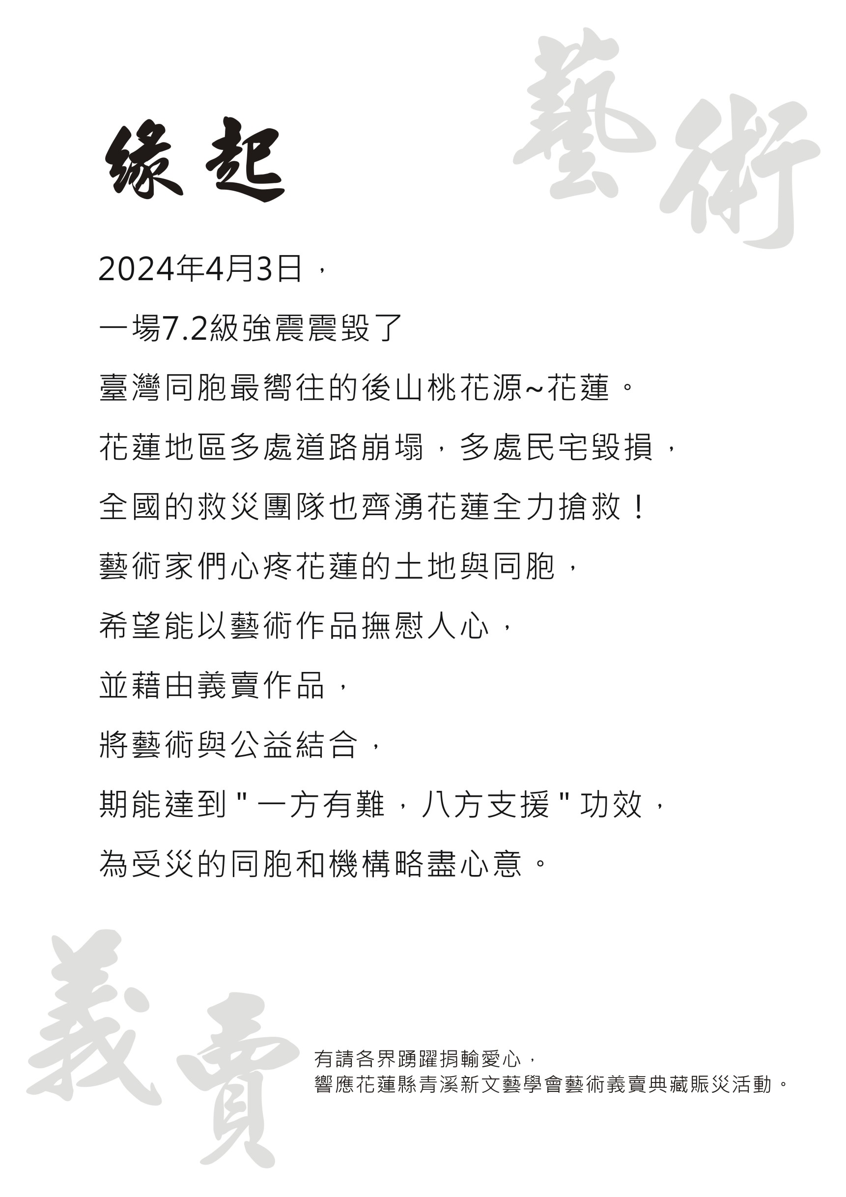 此次共號召三十八位藝術家、老師參與,希望能以藝術作品撫慰人心,並藉由義賣作品將藝術與公益結合,使其達到「一方有難、八方馳援」功效,為受災的同胞和機構略盡心意。
